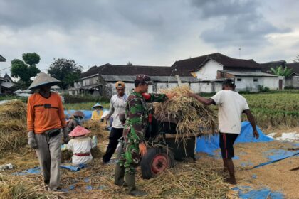 Joosnews.com - Babinsa Koramil 16/Glenmore Sertu Suwarno membantu petani memanen padi di…