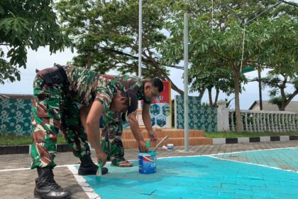 Anggota Koramil Pesanggaran Bergotong Royong Pengecatan Lapangan Voli Sambut HUT TNI ke-79