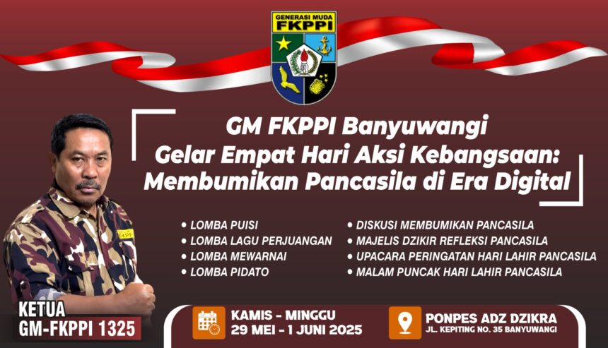 Joosnews.com – Banyuwangi, Dalam rangka memperingati Hari Lahir Pancasila yang jatuh setiap 1 Juni, Generasi Muda Forum Komunikasi Putra Putri Purnawirawan dan Putra Putri TNI-POLRI (GM FKPPI) PC-1325 Banyuwangi akan menggelar rangkaian kegiatan kolaboratif selama empat hari penuh, sejak Kamis hingga Minggu, 29 Mei – 1 Juni 2025.