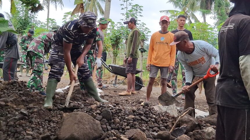 Puluhan anggota TNI bersama warga tampak bahu-membahu dalam proses pembangunan. Nampak di lokasi, para prajurit dan masyarakat bekerja dengan penuh semangat, menyatu dalam semangat kebersamaan demi mewujudkan akses yang lebih baik bagi masyarakat pedesaan.