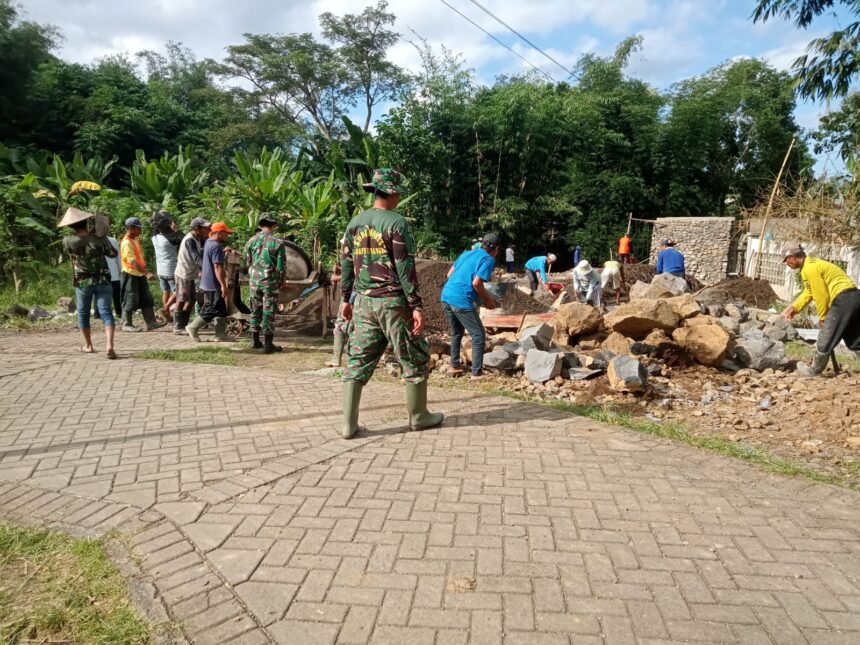 Babinsa Kodim 0825/Banyuwangi bersama masyarakat setempat bahu membahu mengoperasikan mesin molen, mencampur semen, pasir, dan kerikil untuk membentuk campuran beton. Meskipun medan cukup berat, para Babinsa tetap semangat demi kelancaran pembangunan infrastruktur yang sangat dibutuhkan warga.