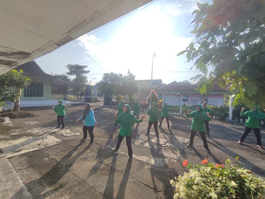 Kegiatan senam bersama ini dilaksanakan oleh seluruh anggota persit Koramil di halaman Makoramil Purwoharjo