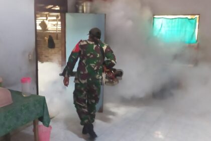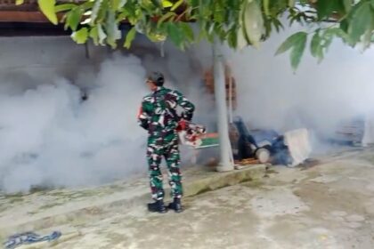 “Babinsa Koramil 0825-08/Srono Banyuwangi Pimpin Aksi Fogging Berantas DBD di Desa Kebaman”