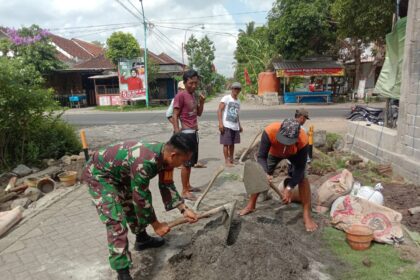 Koramil Purwoharjo mengikuti kegiatan Karya Bakti di desa Glagahagung, Wujudkan Kemanunggalan TNI-Rakyat