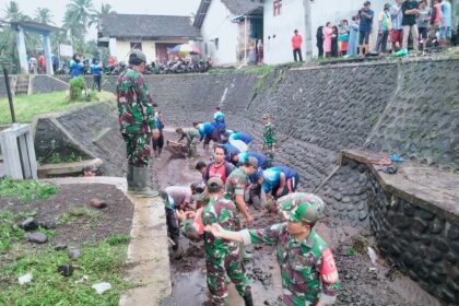 Karya Bakti Produktif Kodim 0825/Banyuwangi, Bersihkan Lumpur dan Batu di Saluran Irigasi Kaliweni
