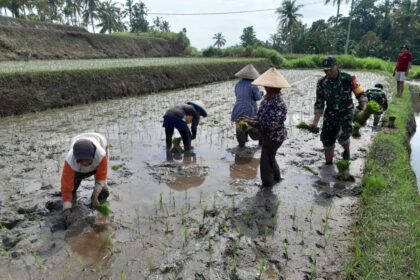 Babinsa Posramil Licin Laksanakan Kegiatan Penanaman Padi Membantu Petani di Desa Gumuk