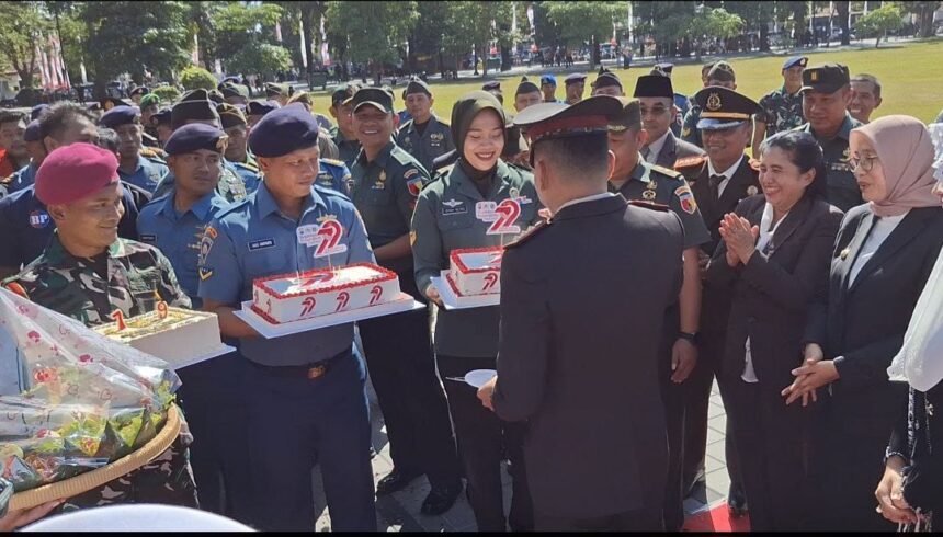 Joosnews.com – Banyuwangi, Dalam semangat sinergitas dan kebersamaan yang produktif, Keluarga Besar Kodim 0825/Banyuwangi memberikan kejutan istimewa berupa surprise Hari Ulang Tahun Bhayangkara Ke-79 kepada Polresta Banyuwangi. Kegiatan ini dipimpin langsung oleh Kasdim 0825/Banyuwangi, Mayor Kav Suprapto, di Taman Blambangan Banyuwangi, Senin (1/7/2025).